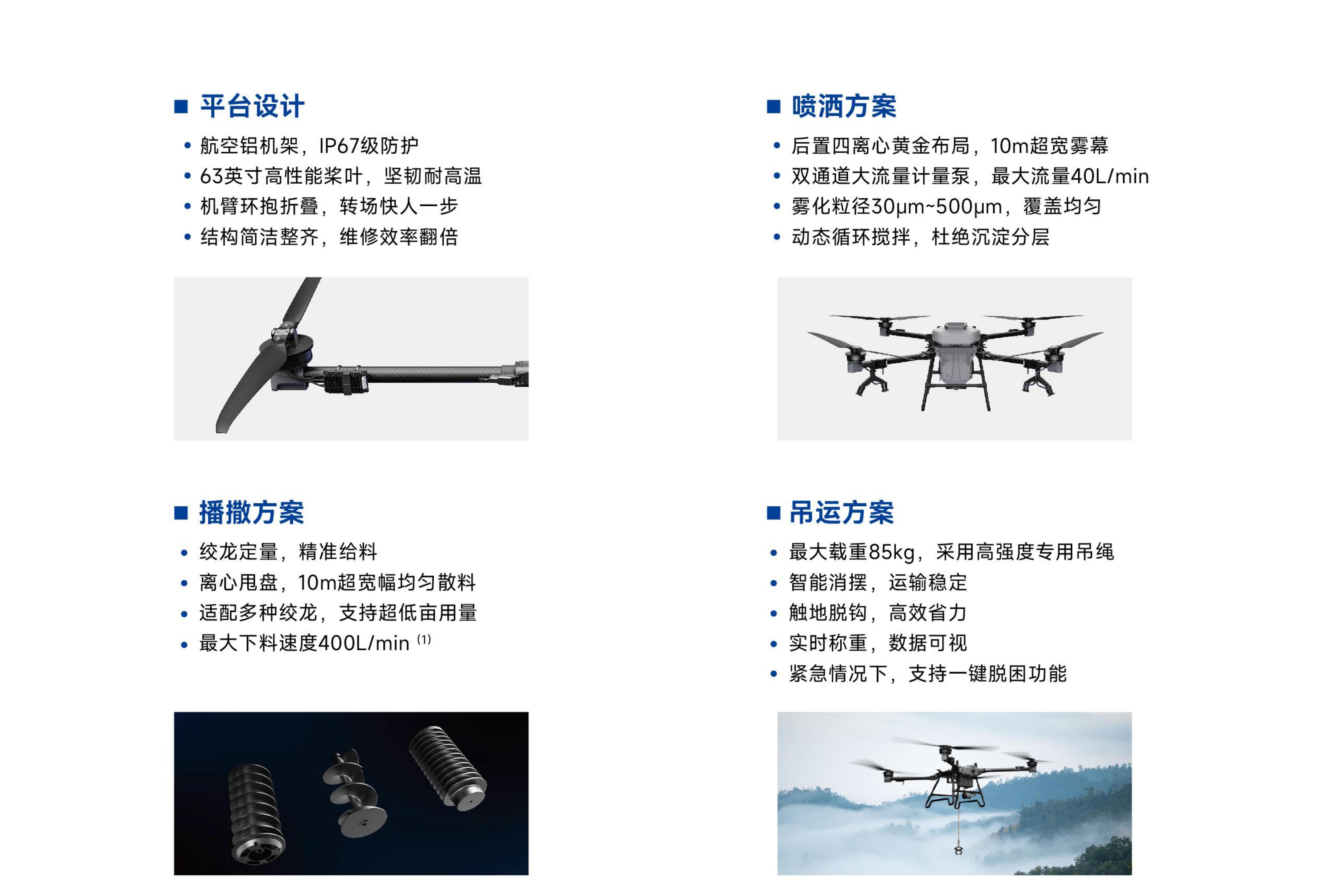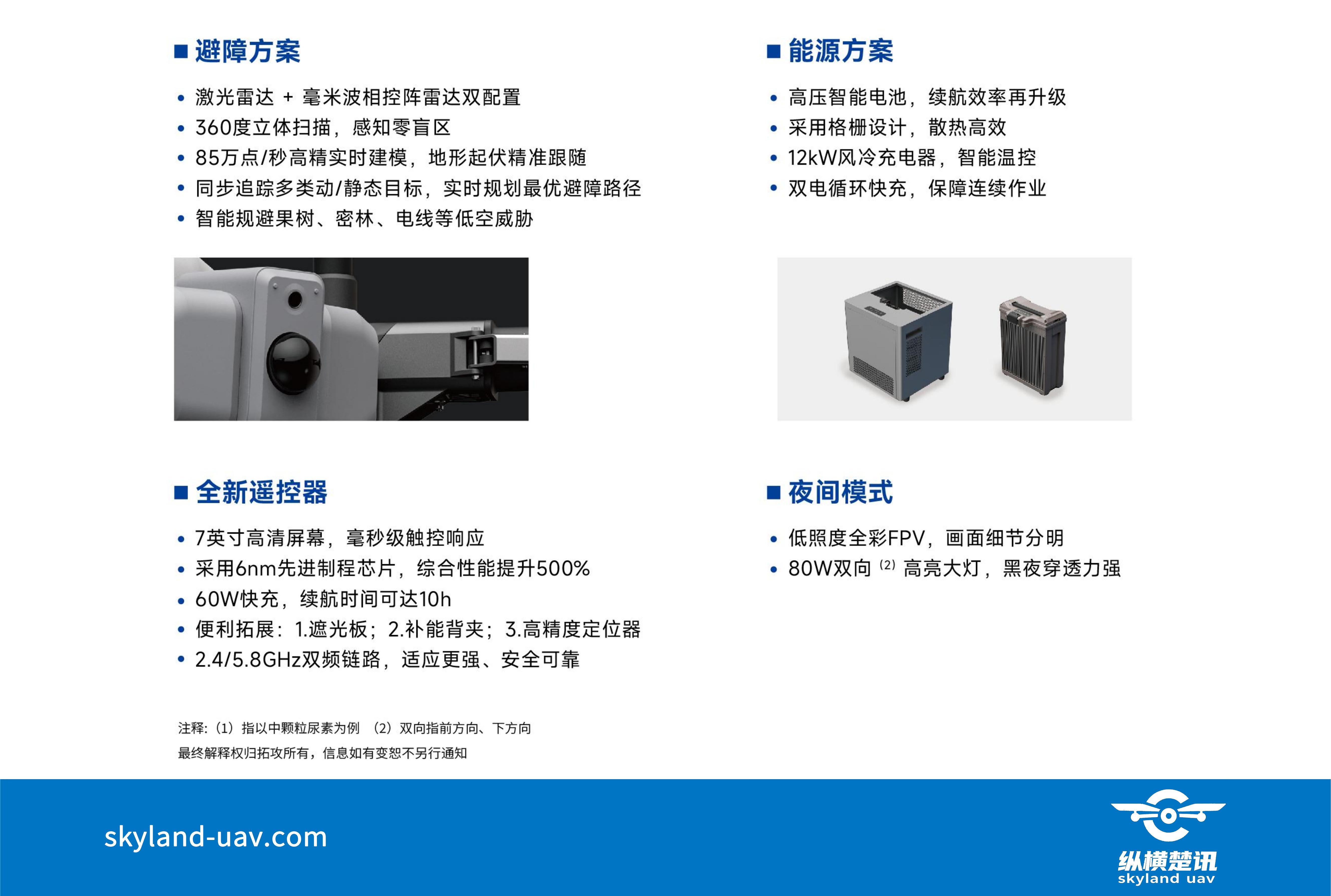 skyland FP800农业无人机焕新升级,提供喷洒、播撒、吊运等多功能方案,结合避障、能源优化和夜间模式,全面提升作业效率与稳定性。
